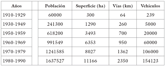 Llama la atención de las cifras de la tabla 5, que entre 1910 y 1959 en un periodo de casi 50 años, la población, la superficie, las vías y los vehículos tienden a incrementarse de manera proporcional en cerca de 10 veces más su valor inicial, pero desde 1960 la proporcionalidad se pierde debido al aumento poblacional dado que como se había explicado anteriormente, la ciudad de Cali es un centro regional por el cual se explica su incremento poblacional. Como un aspecto importante se encuentra también que la urbe responde a la contextualización de las ciudades en expansión donde de igual manera se va incrementando su parque automotor a medida que pasa el tiempo (figura 5).