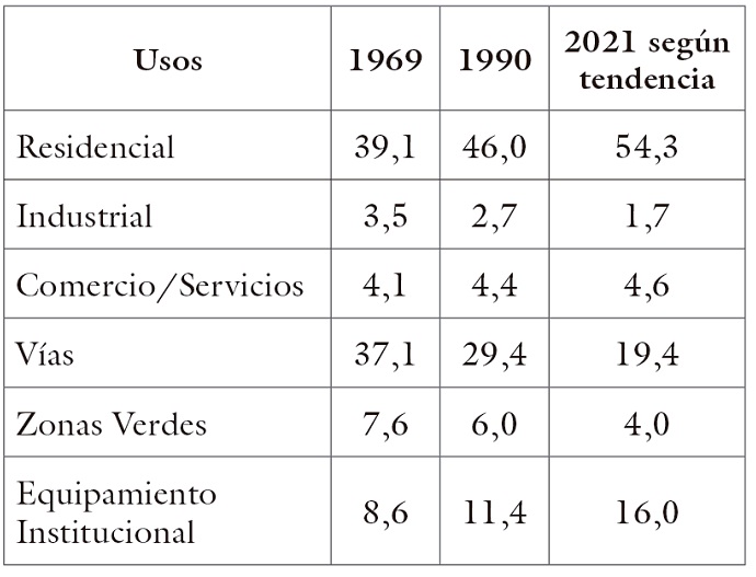 Según la información de los planes territoriales de 2000 y 2014, se encuentra en primer lugar que hay una clara tendencia de crecimiento al año 2021 de usos residenciales, comercio y equipamiento institucional, es decir, hay una expansión en áreas que es probable que sea en altura, dada la escasez de terrenos en Cali. En segundo lugar, desde esta misma compresión se encuentra que los usos del suelo para la industria, en vías y en zonas verdes han venido decreciendo paulatinamente en los últimos 48 años (tabla 6). Es de advertir que ese decrecimiento es más pronunciado en los usos del suelo destinados para las vías con decrecimientos constantes a tasas del 10% cada veinte años desde 1969.