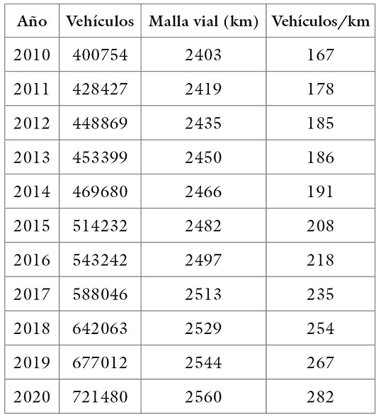 En Arboleda et al. (2012) se estudia el impacto negativo que se genera en Cali debido a la congestión en las vías. Como se puede ver en la tabla 7 y en la figura 6, desde el año 2015 el número de vehículos por kilómetro supera la cifra de 200 automotores y se espera que al año 2020 sean 282 autos en un kilómetro vial.