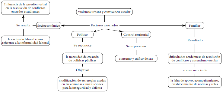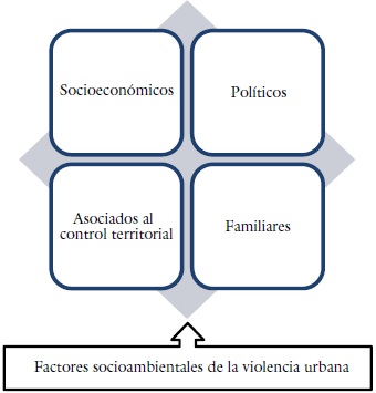 Para López, Pastor, Giraldo y García (2014), la violencia urbana es el resultado de las inequidades socioeconómicas y la precariedad de las orientaciones preventivas, de asistencia social y de justicia que reproduce una nueva consolidación de reglas sociales dentro de las comunidades, aumentando la inseguridad y el conflicto entre sus miembros, aspectos que se trasladan al contexto familiar, escolar, laboral, social, entre otros. Por lo tanto, la violencia urbana es un fenómeno que se da por la interrelación compleja de factores socioambientales como son los factores socioeconómicos, factores políticos, factores asociados al control territorial y, por último, factores familiares(figura 1).