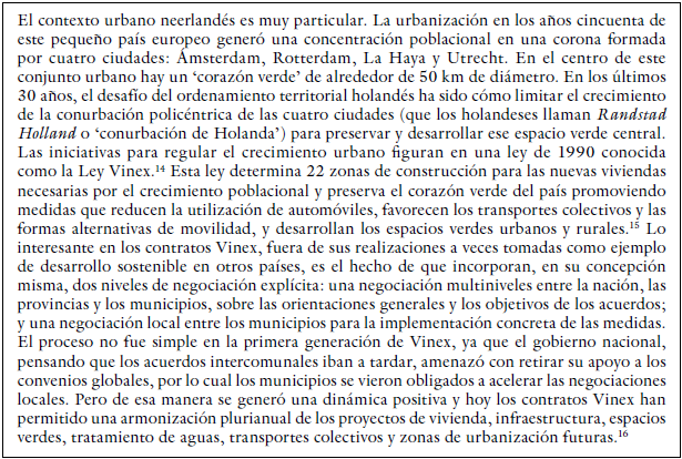 El tercer aporte se ve en la manera cómo la contractualización lleva a las autoridades a organizar la acción pública entre los diferentes actores del desarrollo. Mediante los contratos de acción pública, las prácticas de coordinación interinstitucional que aplicaban una programación directiva o una reglamentación impuesta a través de los planes nacionales de desarrollo, por ejemplo, dejan de ser la norma. Por medio de estos contratos se impone progresivamente el modelo de la negociación explícita y de la cooperación voluntaria, y se define un nuevo marco de gobernanza inclusiva. Las convenciones entre diferentes niveles de gobierno implementadas en los años noventa para controlar el crecimiento de las ciudades holandesas ilustran bien este tipo de aporte (tabla 2).
