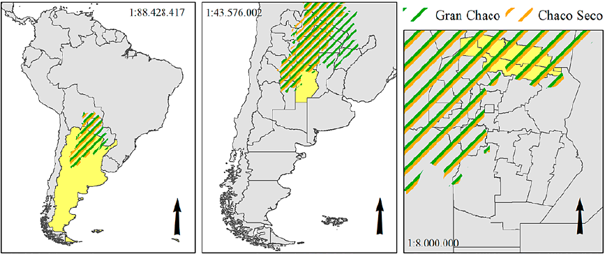 Si consideramos una escala de análisis centrada en el nivel continental, los departamentos del norte cordobés (Río Seco, Sobremonte y Tulumba) comprenden el extremo meridional del Gran Chaco americano (figuras 1 y 2), que abarca cerca de 1 millón de km² que se extienden sobre parte de los territorios de Argentina, Bolivia, Paraguay y, en menor medida, Brasil. Se trata de la tercera ecorregión de Latinoamérica de acuerdo con sus dimensiones, y uno de los repositorios de biodiversidad más relevantes de la región en relación con su amplia variedad de ambientes, entre los que se destacan los bosques, pastizales y humedales (Morello & Rodríguez, 2009). Dado su potencial agrícola, constituye en la actualidad una de las ecorregiones más amenazadas del mundo, encontrándose protegida solo un 9 % de su superficie (Kuemmerle et al., 2017). El 50 % de su extensión se concentra en Argentina, donde se encuentra además la mayor parte del terreno convertido a usos agropecuarios (Morello et al., 2009).