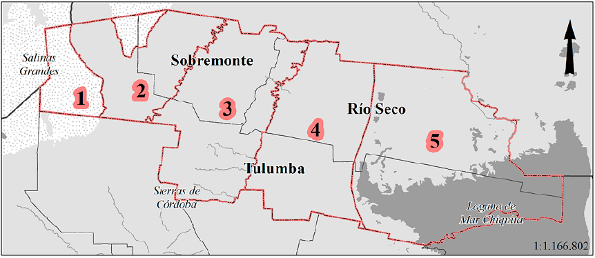 Referencias: 1) Salinas Grandes, 2) planicie occidental, 3) sistema serrano, 4) planicie oriental, 5) depresión de Mar Chiquita.