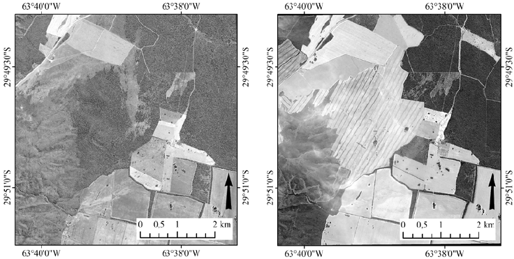 Las imágenes dan cuenta de una radical transformación en los usos del suelo, donde las actividades tradicionales, vinculadas a la ganadería extensiva (bovinos y caprinos) y a la obtención de leña y carbón del monte, fueron reemplazadas por la agricultura de secano (soja y maíz) en combinación con ganadería intensiva (adopción de feedlots).