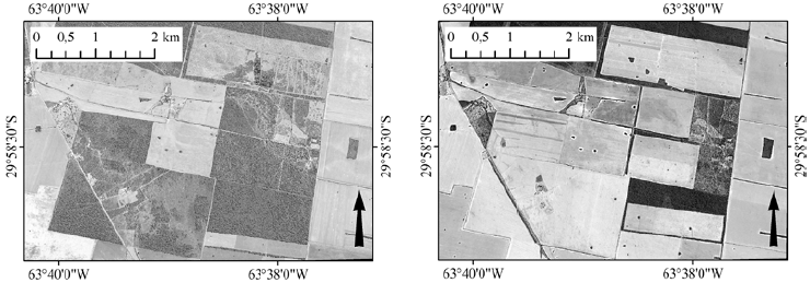 Las figuras 3 y 4 ejemplifican las características asumidas por el desmonte de parcelas de gran tamaño entre los años 2002 y 2013 en el área conocida como planicie oriental, que atraviesa perpendicularmente los departamentos Río Seco y Tulumba —al este de las sierras de Córdoba— y concentra los suelos de mayor aptitud agrícola (ver figura 2). El sector indicado comprende desde la década de 1990 el escenario privilegiado de la expansión agraria en el norte cordobés. Este estuvo ocupado hasta el siglo xx por bosques de quebracho blanco y colorado (Cabido & Zak, 1999) que fueron prácticamente erradicados como consecuencia, primero, de la tala vinculada al desarrollo de la red ferroviaria y, posteriormente, a la ampliación de la superficie destinada a los cultivos.