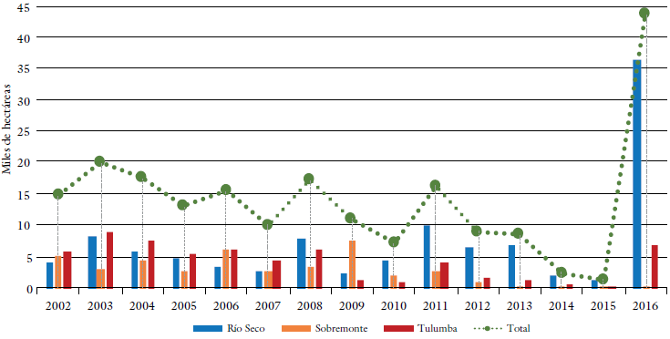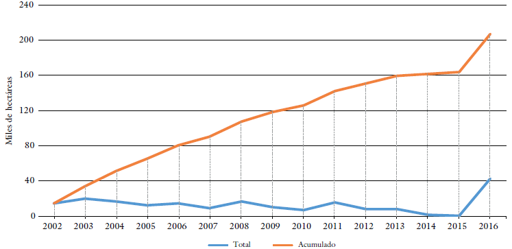 Nota: debe tenerse en cuenta que el valor acumulado indicado para el año 2002 responde a una abstracción metodológica, dado que, si se toma en cuenta la serie completa, iniciada en el año 1976, el acumulado total alcanza las 374 566,38 ha.