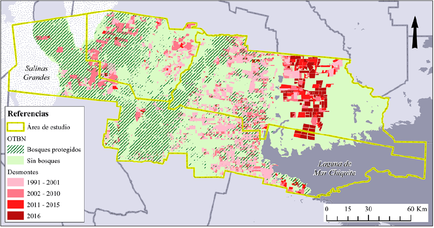 A nivel de cada uno de ellos, se apreció una distribución heterogénea de las tareas de desmonte, que fue asociada a una hipotética línea de avance de la frontera agraria moderna, cuya orientación predominante está dirigida hacia el norte y este de la provincia. Simultáneamente, luego de la puesta en marcha del OTBN en 2010 se observó una concentración del proceso de deforestación en el sector de montes bajos que comprende el área de transición hacia los pastizales de la depresión de Mar Chiquita (departamentos Río Seco y Tulumba). Esto puede explicarse porque se trata de un sector del área de estudio que fue excluido de los espacios de conservación designados a través de la ley, habilitando así una vía de progresión para el avance de la frontera.