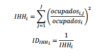 Para medir el grado de concentración en una industria o mercado se utilizó el Índice de Herfindahl-Hirschman (IHH), definido como la sumatoria de la participación de cada sector de la variable medida (en este caso el empleo) en el total regional, elevada al cuadrado. El inverso del IHH (IDIHH) constituye un indicador del grado de diversificación regional, de manera que el valor del índice se incrementa a medida que aumenta la diversidad regional ( Jaramillo, 2016; Rodríguez Miranda, 2013).