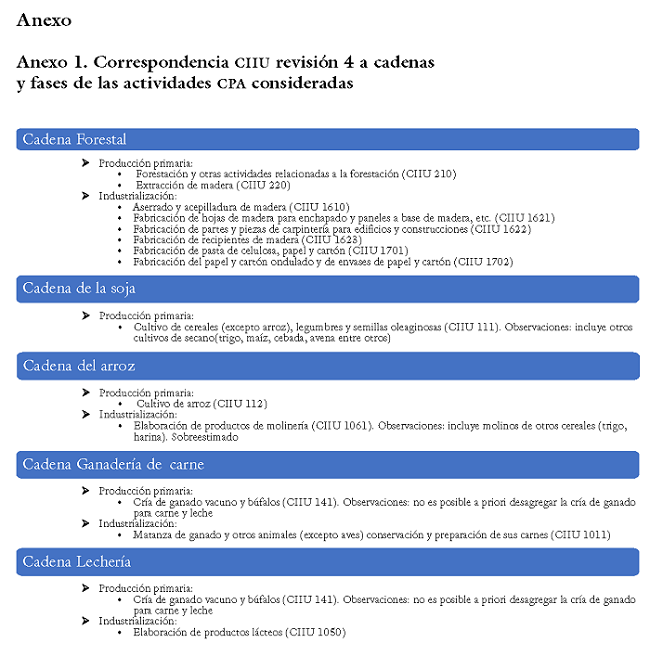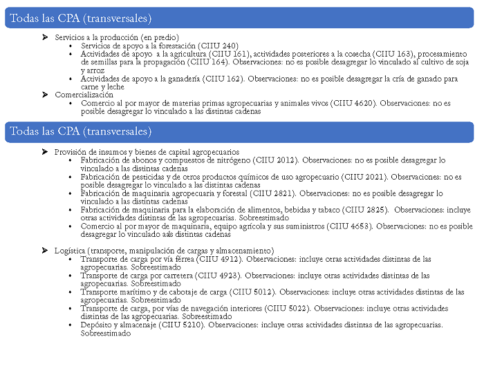 En el Anexo 1 se detallan las correspondencias entre los códigos ciiu revisión 4 y las cadenas/fases definidas en las CPA, así como algunas consideraciones para tener en cuenta respecto a las estimaciones obtenidas de acuerdo con la definición de las distintas actividades en el clasificador.