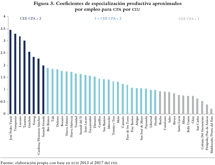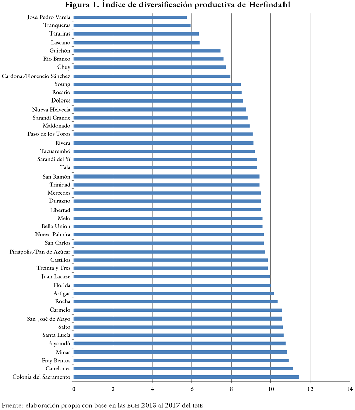Se calcularon indicadores de especialización y diversificación por empleo a partir de la Encuesta Continua de Hogares (ECH) del Instituto Nacional de Estadísticas (INE) para las Ciudades de más de 5000 habitantes, entre 2013 y 2017. La ECH permite obtener información sometida a crítica, validada y específica tanto del empleo como de las características socioeconómicas de las personas desagregadas para las entidades territoriales definidas. Desde el año 2006, la ECH cuenta con una cobertura total del país.