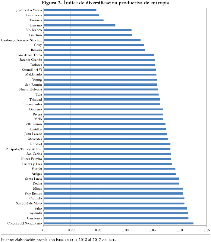 A nivel general, Colonia del Sacramento, Canelones, Fray Bentos, Minas, Paysandú, Salto, San José de Mayo, Carmelo y Santa Lucía se encuentran entre las CIU con mayor diversificación productiva en términos relativos. Por otro lado, Lascano, Tarariras, Tranqueras y José Pedro Varela son las Ciudades con menor diversificación de actividades económicas tanto por el IHH como por el indicador de entropía y reflejan, por lo tanto, economías más especializadas ( figuras 1 y 2).