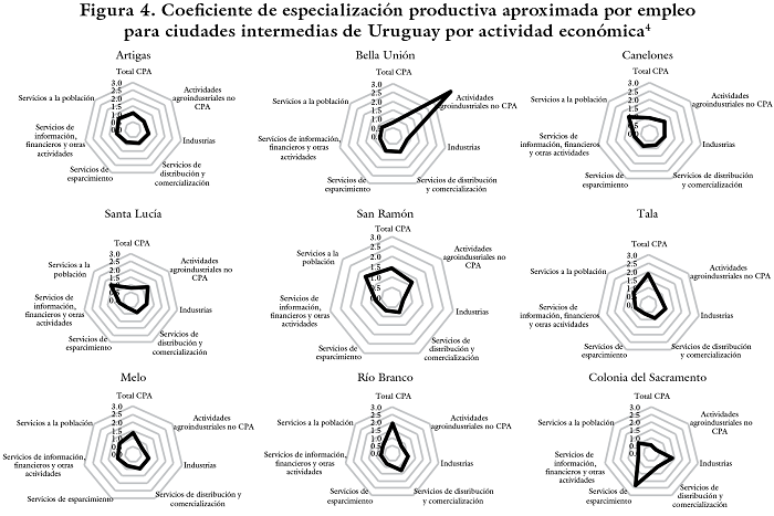 Por otra parte, resulta interesante analizar aquellas CIU que reflejan una preponderancia de otras actividades primarias y agroindustrias no consideradas dentro del estudio. Es el caso por ejemplo de Bella Unión, donde predomina el cultivo de caña de azúcar y la horticultura; Salto, especializado en la producción de cítricos y en horticultura, y Paysandú, con una fuerte presencia de las industrias laneras y del cuero y de la actividad citrícola.
