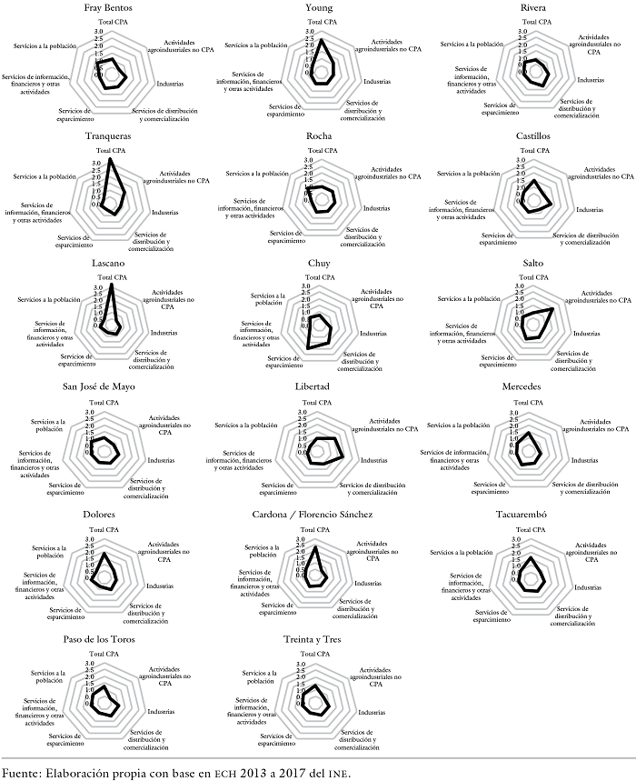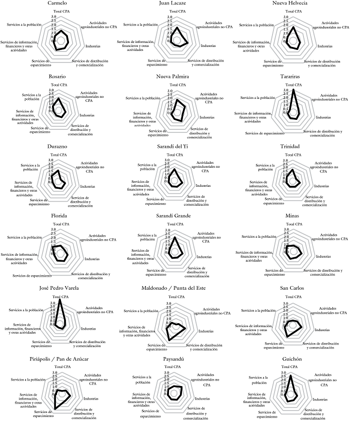 Es de destacar, además, la interacción sinérgica que se genera entre las actividades visualizadas en algunas localidades; por ejemplo, de José Pedro Varela y Tranqueras, clasificadas como las localidades con mayor especialización productiva en las CPA analizadas respecto al promedio nacional, donde se observa la presencia de sistemas pecuario-arroceros y silvo-pastoriles, respectivamente. En tanto, una interacción similar se observa en Cardona, Florencio Sánchez, Nueva Palmira y Carmelo, donde la preponderancia de la actividad agrícola y la cercanía de las dos plantas procesadoras de pasta de celulosa del país han inducido también a una mayor especialización relativa en materia de servicios logísticos.