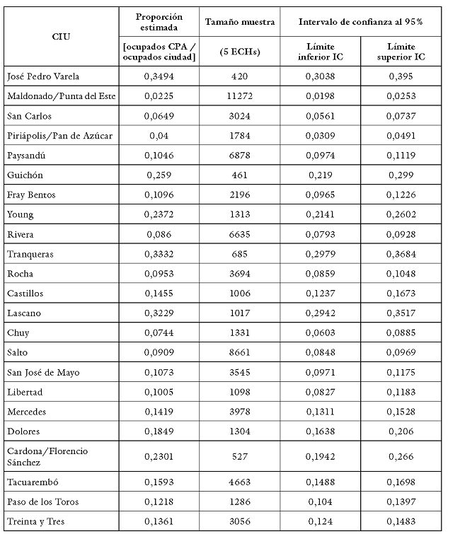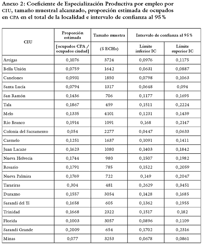 El Anexo 2 presenta el listado de CIUdades consideradas, el tamaño de muestra logrado con la estrategia adoptada, la estimación puntual de la proporción de empleo en las CPA en el total de la localidad (que corresponde al numerador del CEE) y su intervalo de confianza al 95 %.
