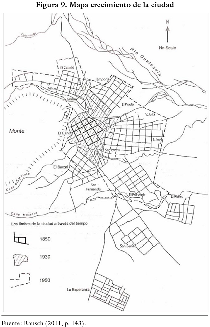 El crecimiento de la mancha urbana de Villavicencio hasta 1950, aproximadamente, que hasta ahora se ha descrito como una formación histórica y obligada por el encuentro de caminos y elementos económicos que la atraviesan, se puede evidenciar en la figura 9, realizada por Rausch (2011), donde se hace una aproximación a tres diferentes etapas de crecimiento de la ciudad. Inicia en 1850 como punto originario oficial de la ciudad; en segundo lugar, se anota la década de 1930 con una primera explosión demográfica dada por los diferentes factores económicos y sociales definidos a lo largo del artículo, y, por último, la década de 1950 con la oleada de inmigrantes, desplazados de la violencia.