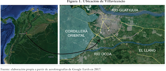 La zona urbana de Villavicencio, capital del departamento del Meta y principal ciudad de la Orinoquía y la Amazonía colombianas, está ubicada en el centro geográfico del país ( figura 1). Cuenta con 452 472 habitantes ( Alcaldía de Villavicencio, 2016), albergando el 66,57 % de la población del departamento del Meta. 1 Tiene una extensión aproximada de 1328 km 2, una altura sobre el nivel del mar de 457 m, una temperatura media de 28ºC y está ubicada a 71,7 km de Bogotá.