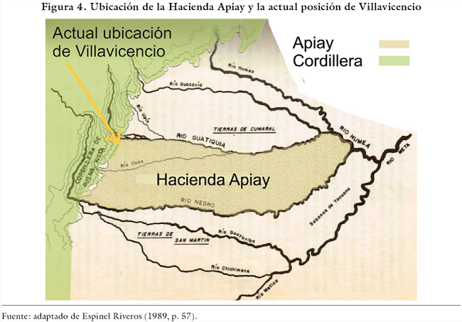 Según Espinel Riveros (1989), la misión jesuita entró a los llanos en 1625 y fundó varias haciendas, una de ellas fue la de Apiay en 1740 ( figura 4), que llegó a ser una de las más prósperas, cuya localización es en lo que actualmente corresponde a Villavicencio.