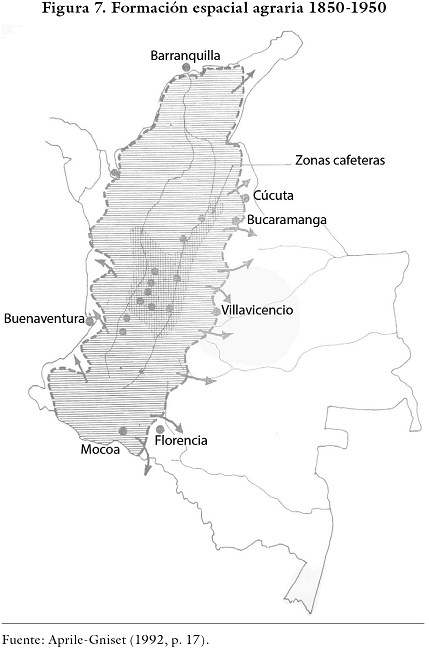 Esta dinámica demuestra la afirmación de Aprile-Gniset (1992) al plantear que en Colombia durante 100 años se fundan más ciudades que durante toda la época colonial ( figura 7), en especial debido a una formación agraria, que hace que algunas ciudades tradicionales desaparezcan.