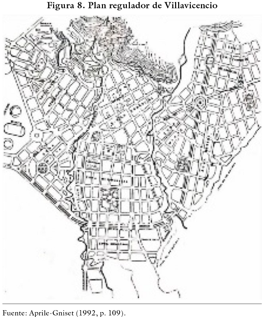 En consecuencia, la zona urbana de la ciudad pasó de 43 manzanas en 1937 a 82 en 1958 y a 321 en 1964 ( Ojeda, 2000). Esto ocurrió debido a la tecnificación de los planes reguladores inspirados en el modernismo, con énfasis en la jerarquización de las vías arterias, el uso de curvas y diagonales, que cambiaron el estilo colonial por el francés e inglés. En consecuencia, la ciudad tuvo un nuevo empuje de crecimiento espontáneo sin recursos y con una planificación incipiente que aumentó los suburbios y las viviendas autoconstruidas ubicadas principalmente sobre los ejes viales que fueron y son aún los rectores de crecimiento más representativos de la ciudad. Estas infraestructuras se amontonaban en lugares insalubres y peligrosos sin ningún seguimiento institucional ( Rausch, 2011) a pesar de la existencia de un plan regulador de Villavicencio ( figura 8), frente al cual Aprile-Gniset (1992) anota: