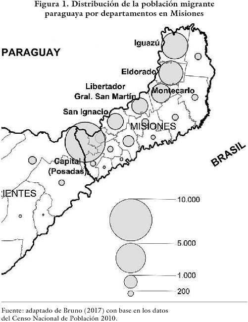 A partir de esto, el artículo explora los modos particulares de integración urbana y sociocultural de una familia de migrantes paraguayos en Eldorado, una ciudad intermedia 2 que es la cuarta más poblada y la tercera con mayor cantidad de migrantes de dicho origen en Misiones ( figura 1). No es casual que esta provincia se configure actualmente como el segundo destino más elegido por las y los paraguayas/os —9,9 % —, luego de Buenos Aires y su área metropolitana —75,39 %— ( INDEC, 2012). En esta red de localidades, como veremos, Eldorado constituye una ciudad atravesada por un acelerado proceso de urbanización y crecimiento poblacional desde 1980 hasta la actualidad. Además, fue fundada por migrantes de origen europeo, quienes también convivieron con la histórica migración paraguaya en el lugar.