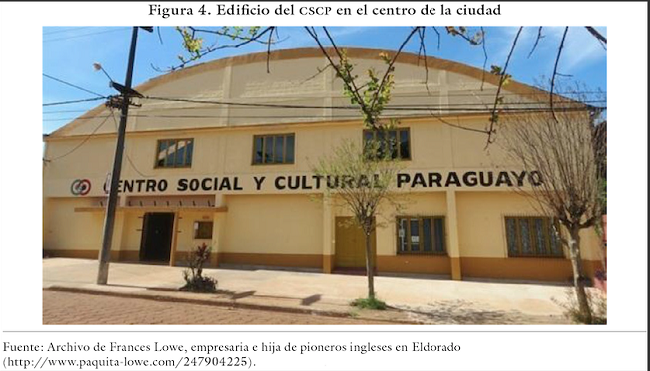 Por otro lado, la interacción de la familia con la ciudad no se limitó a la empresa comercial. También se interesaron por el desarrollo social y cultural. La familia es referente de la cultura paraguaya en la localidad, ya que Nicolás fue presidente del único centro cultural paraguayo en Eldorado. Una tarde nos llevaron a visitarlo, muy cerca del centro urbano, es un edificio de amplias dimensiones con un gran salón, una biblioteca y un pequeño santuario a la virgen de Caacupé en la entrada. Entre los años 1993 y 2003, él y su familia contribuyeron en gran parte con el crecimiento edilicio, social y económico del Centro Social y Cultural Paraguayo (CSCP) fundado hace 80 años ( figura 4). Al respecto, algunos vecinos recuerdan al CSCP como una “institución que supo enaltecer las costumbres, arraigos y tradiciones de los hermanos paraguayos. Sede social y dirigencia siempre al servicio de la comunidad eldoradense toda!” ( Eldorado en el recuerdo, 2017).