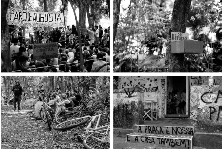 Hay cuatro grupos principales que actúan en pro del Parque Augusta:13 (i) Sociedade dos Amigos, Moradores e Empreendedores do Bairro de Cerqueira César (Samorcc), una asociación de vecinos creada en el 2001 que trabaja con diferentes demandas en la región; (ii) Aliados do Parque Augusta, también llamado “sos Parque Augusta”, un grupo generalmente formado por siete activistas que desde el 2004 se dedican exclusivamente a la causa; (iii) Parque Augusta sem Prédios, un grupo defensor de causas ambientales e indígenas; y (iv) Organismo Parque Augusta (opa), movimiento horizontal y autogestionado que empezó en las manifestaciones del 2013. Así mismo, se nota la presencia de otras subscripciones, como el Movimento Parque Augusta —que designa la coalición de algunos grupos—, y también la Autogestão Parque Augusta, denominación creada durante el momento de la ocupación colectiva.