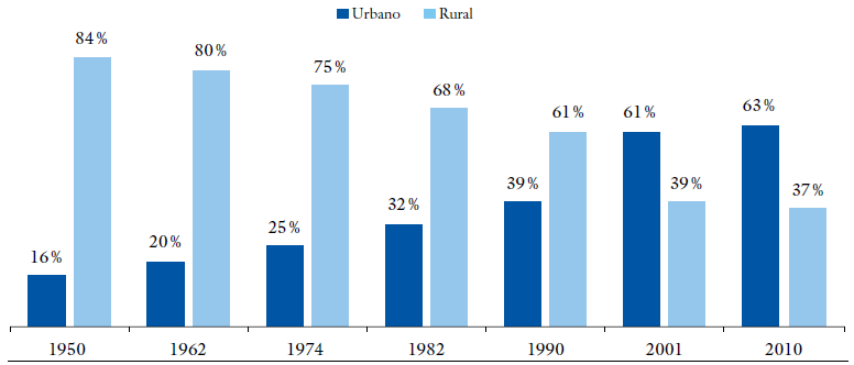La figura 2 muestra la evolución de la población por lugar de residencia, con énfasis en el rápido crecimiento de la población urbana. El país que hasta 1990 tenía el 39 % de la población viviendo en el espacio urbano, a principios de siglo xx, entre el 2001 y el 2010, aumentó al 61 % y al 63 % de la población total, respectivamente. La población rural disminuyó considerablemente, como parte de los graves efectos que la crisis y otros factores descritos causaron a la dinámica de la población del país.