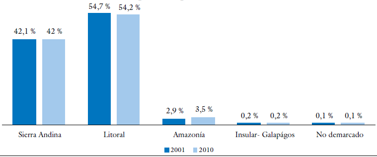 Con base en estas características, se puede decir que la red urbana ecuatoriana es muy incipiente y altamente verticalizada por Quito, en la región de Sierra, Guayaquil y en la región de la Costa. Pero la red urbana del Ecuador está más dispersa hoy en su conjunto de centros urbanos que en el pasado. Al considerar la distribución de la población por las cuatro regiones naturales del país (Costa, Sierra, Amazonía e Insular), se observa en la figura 4 que hay una concentración de más del 90% (96,2%) de la población en dos de ellos, Sierra y Litoral, debido a sus características históricas y espaciales de ocupación.