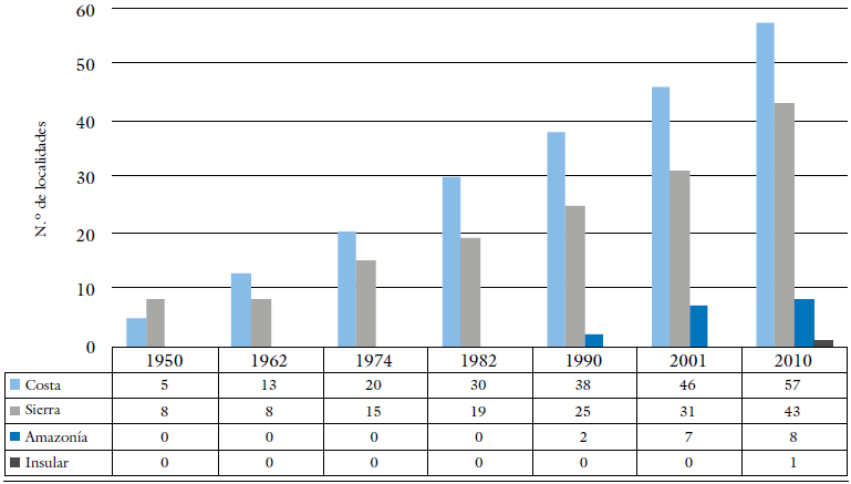 A su vez, como se observa en la figura 5, hay un salto en el número de ubicaciones con más de 10 mil habitantes de 49 a 65 entre 1982 y 1990, y en el periodo 1990-2010 hubo 44 ubicaciones más. Entre el último y el penúltimo censo, surgieron 25 ubicaciones más, y de ellas, 16 pertenecen a las regiones de Amazonía e Insular. Estas proyecciones indican una tendencia de dispersión en los centros urbanos de Ecuador en los próximos años.