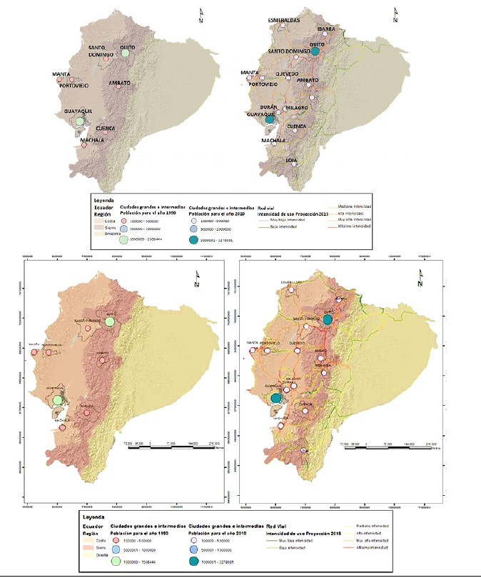 Las proyecciones de población para el 2020, realizadas por la Secretaría Técnica Planifica Ecuador (antes Senplades) y el inec, indican que la región de la Sierra mantendrá la tasa de urbanización estable, pero la provincia de Loja aumentará la tasa de urbanización de 55,0 a 65,0%; la región de la Costa aumentará la tasa de urbanización del 71,3 al 73,9%, con la provincia de Esmeraldas teniendo el aumento más significativo del 49,0 al 63,7%; en la Amazonía, la tasa de urbanización regional proyectada es la más alta, pasando de 38,6 a 43,0 %, con la provincia de Orellana teniendo el aumento más expresivo de todos, de 40,4 a 56,2%, según las proyecciones. La región Insular será la única que tendrá una caída significativa en la tasa de urbanización del 82,9 al 54,3%. Esto puede confirmarse por el número de centros urbanos con más de 10 mil habitantes desde 1990, según la figura 5.