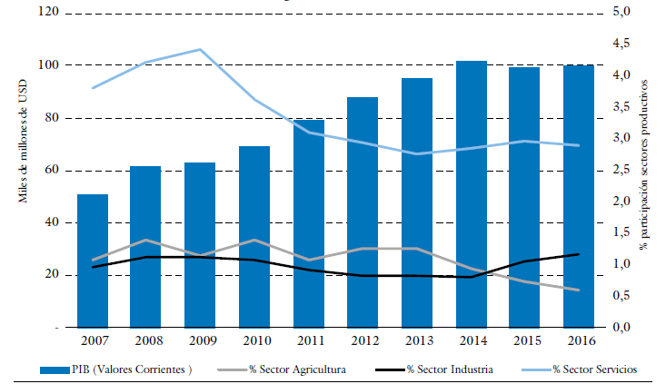 En lo que respecta a los sectores productivos durante el periodo analizado estos sufrieron alteraciones, siendo el sector de servicios el de mayor dinamismo aportando una contribución mínima de 200 millones de dólares en el 2007 y una contribución máxima de 294 millones de dólares en el 2015 al pib nacional. El sector agrícola e industrial contribuyó en menor medida, pero con valores próximos entre ellos, como se puede observar en la figura 8.