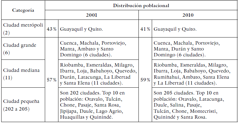 En vista de lo anterior, han surgido estudios sobre la caracterización actual de la red urbana en Ecuador. Tal es el caso del Informe Nacional de Ecuador para la Tercera Conferencia de las Naciones Unidas sobre Vivienda y Desarrollo Urbano Sostenible (habitat iii), que presenta una serie de datos económicos, sociales y espaciales importantes y muestra cómo se distribuye la población en el territorio (tabla 1), según las categorías de ciudades —metrópolis, ciudad grande, ciudad mediana y ciudad pequeña—. Hay una caída en la participación relativa de la población de las metrópolis y un aumento proporcional en la participación de ciudades grandes, medianas y pequeñas, agregadas entre el 2001 y el 2010. El criterio de población tiene grandes limitaciones, pero muestra el peso creciente de las aglomeraciones no metropolitanas.