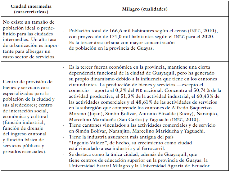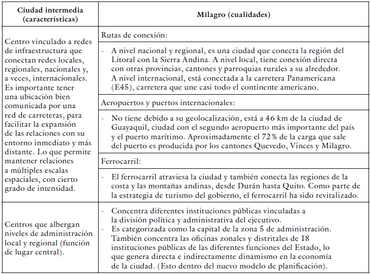 Entre las características y cualidades que debe tener una ciudad intermediaria, de acuerdo con diferentes aspectos, se destacan las siguientes: ser un centro que sirva bienes y servicios casi especializados tanto para sí misma como para las localidades vecinas; ser un centro de interacción social, económica y cultural; ser centro vinculado a redes de infraestructura que conectan redes locales, regionales y nacionales, e incluso, redes internacionales; ser centro o base administrativa de los niveles de gobierno local y regional, entre otras características locales (Bellet & Llop, 2004). En tal sentido, Milagro contempla todos estos criterios.