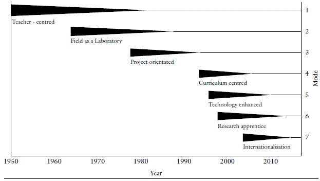 La revisión de los debates contemporáneos acerca de la importancia del trabajo de campo en los procesos de aprendizaje, proporciona algunas observaciones relevantes para el desarrollo futuro de esta pedagogía en la conservación (Dunphy & Spellman, 2009; France & Haigh, 2018; Fuller et al., 2006; Scott et al., 2006). En corcordancia, Fuller et al. (2006) examinaron cuatro estudios de caso: dos en el Reino Unido (Chester y Liverpool), uno en Singapur y, otro en Nueva Zelanda. En todos se llegó a la conclusión de la efectividad del trabajo de campo en los programas de estudio de geografía. En Nueva Zelanda, por ejemplo, cuestionaron la competencia del trabajo de campo en la década de 1990 (cuando se percibía como un método de aprendizaje pasivo en lugar de activo) y promovieron una reorientación de este enfoque, como la asignación de ejercicios de solución de problemas en grupos pequeños en lugar de toda la clase; un cambio similar ocurrió en otras regiones como el Reino Unido. Un estudio previo de Kent et al. (1997) y más recientemente, France y Haigh (2018), apoyaron este argumento (véase figura 1 y 2). Su revisión crítica sobre la metodología del trabajo de campo en las universidades del Reino Unido desde la década de 1950, pone especial énfasis en la participación directa tanto de docentes como de estudiantes. Ambos estudios señalaron el paso de los estudiantes de dependientes a autónomos como uno de los resultados más importantes de este cambio.