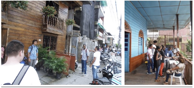 El primer día inició con la presentación del programa del taller y la divisón de los 30 estudiantes en tres grupos, cada uno liderado por un tutor/docente. Luego se dictaron tres charlas estilo conferencia: la primera, impartida por el segundo autor, trataba sobre preservación arquitectónica y patología de la madera; la segunda, por Douglas Cujar-Castañedas, arquitecto experto en arquitectura e historia urbana de la zona, proporcionó una visión significativa de los edificios históricos y el desarrollo urbano de Quibdó (figura 5), y la tercera, por la arquitecta Johana Lozano, directora del programa de arquitectura en la utch, presentó su investigación sobre tipologías de viviendas en zonas inundables y no inundables en Chocó, ampliada por sus alumnos.