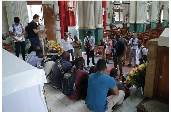 El segundo día comenzó con una visita al principal hito histórico de la ciudad, la catedral San Francisco de Asis, construida entre 1946 y 1979, y la Casa de la Diócesis construida entre 1931 y 1942 (véase figura 6), guiados por el padre Napoleón García, quien vinculó el desarrollo de la comunidad afrodescendiente en Quibdó con la historia de la catedral y sus diferentes etapas de construcción. Luego, los estudiantes pasaron el resto del día inspeccionando sus edificios asignados (figura 4).