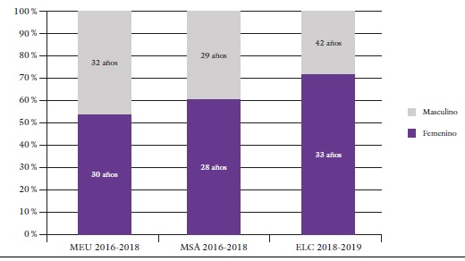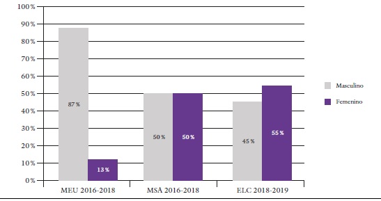 En referencia con el acceso, retención y graduación de mujeres en los estudios de posgrado, existen investigaciones que denotan una creciente feminización de la matrícula universitaria en las últimas décadas (Pizano, 2014). Ello se reafirma en los tres programas académicos considerando que el porcentaje de mujeres inscritas asciende a 54 % en meu, 61 % en msa y 72 % en elc (véase figura 2). Un dato para remarcar es la política de acción afirmativa para la mayor inscripción de estudiantes mujeres en la elc, como un requisito que busca fomentar la igualdad de oportunidades en la educación en modalidad en línea, que sin embargo, también redundó en que la edad promedio de los estudiantes sea superior al resto de programas académicos.