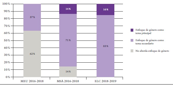 Así mismo, existe una tendencia para abordar el enfoque de género en los currículos desde una perspectiva institucional, en tanto que herramienta metodológica y no en abordaje teórico. Por ejemplo, en el caso de las referencias bibliográficas del meu, un 56 % de las alusiones a temas de género corresponden a útiles de gobernanza, leyes y planes de desarrollo. En el caso de la elc, estos temas corresponden a un 45 % de las referencias bibliográficas. Sin negar la importancia de este acercamiento institucional, es importante recalcar la ausencia de análisis crítico del enfoque de género en la docencia. Las referencias a epistemologías feministas son limitadas, con una prevalencia en tan solo un 11 % y un 13 % de los currículos de la msa y meu, respectivamente. En consecuencia, se crea un vacío teórico en el cual el enfoque de género es reconocido, pero no analizado.