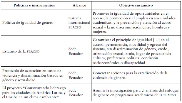 En el caso de flacso Ecuador, la universidad ha generado una normativa interna relacionada al principio de igualdad y no discriminación, con énfasis en la igualdad de género (véase tabla 1). Conforme señalan Arauz y González (2020), tanto la política como el estatuto de flacso Ecuador se centran en aspectos relativos al acceso, permanencia, movilidad y egreso del sistema universitario, haciendo énfasis en la prevención y atención al acoso sexual y la no discriminación entre hombres y mujeres. Es decir, estos instrumentos “no identifican a la transversalización del enfoque de género en el currículo como uno de los mecanismos para garantizar los principios de igualdad y no discriminación en los programas académicos” (2020, p. 9).