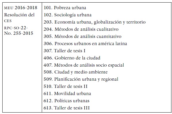 La maestría en Estudios Urbanos (meu) busca “formar profesionales capaces de generar conocimiento científico y formular políticas, planes, proyectos e iniciativas en el ámbito de los estudios de la ciudad a través de la adquisición de conocimientos, herramientas teóricas, prácticas y metodológicas que permitan comprender el carácter multidimensional de los fenómenos urbanos”. Entre sus objetivos específicos busca comprender el carácter multidimensional de los fenómenos urbanos, contribuir a la investigación y reflexión comparada a nivel regional, así como analizar la problemática urbana a partir de la diversidad social y cultural, visibilizando los distintos saberes y actores históricamente excluidos. El programa cuenta con doce materias y tres talleres de tesis. En este caso, el programa busca visibilizar la participación social de los actores históricamente excluidos por razones de género y otras formas de desigualdad (flacso Ecuador, 2015b).