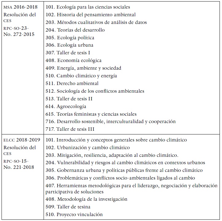 La msa incluye un curso sobre teorías feministas y ciencias sociales (msa615) con bibliografía amplia y especializada que aborda los diferentes enfoques usados para analizar las relaciones entre género y ambiente: ecofeminismo, ambientalismo feminista, ecología política feminista, entre otros. Si bien resulta extenso citar la bibliografía utilizada en esta asignatura, es importante destacar el esfuerzo de contextualización específica a América Latina (Paulson, 2013) y Ecuador (Cuvi Sánchez et al., 2006; Paulson et al., 2009; Poats et al., 2007; Sylva Charvet, 2008), a través de estudios de caso que dan cuenta de redes de investigación articuladas en torno a proyectos colectivos de alcance regional. En este programa académico existe una mayor inclusión de temáticas y lecturas específicas a la problemática de género en los cursos de ecología política y desarrollo sostenible: (msa305 “Ecología política”), sociología de conflictos socioambientales (msa512 “Teorías feministas y ciencias sociales”), agroecología (msa614), e interculturalidad y cooperación (msa716).