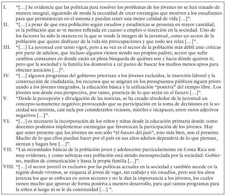 Es por esto que, para lograr el involucramiento crítico de las personas jóvenes de la comunidad de La Argentina, hay que trascender las preconstrucciones que impiden la participación efectiva de este grupo. Como se verá en la tabla 3, mediante diferentes estrategias se logró profundizar en ideas sobre las personas jóvenes y cómo transformarlas.