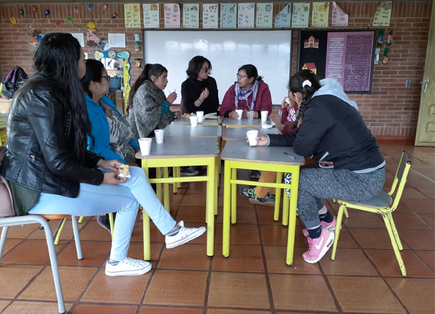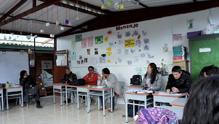 Para efectos de esta investigación, el concepto de reterritorialización no es el que se reduce a los discursos globalizados y globalizantes que la enmarcan en oposición a la desterritorialización, sino que se entiende en el sentido de Beatriz Nates Cruz —al referirse a García Canclini— en su texto Soportes teóricos y etnográficos sobre conceptos de territorio (2010), es decir, como relocalizaciones territoriales que pueden ser relativas parcialmente a viejas y nuevas producciones simbólicas (p. 216). En tal sentido, las mesas de trabajo (figura 9) permitieron reconocer que la reterritorialización del Colegio Rural Mochuelo Alto se da por la participación de diferentes, diversas y desiguales territorialidades que participan de su configuración histórica, las cuales se conforman por un carácter movible y mudable de sus agentes participantes.