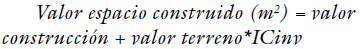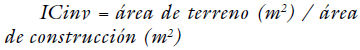 Finalmente, con el objeto de unificar los valores por metro cuadrado, es necesario determinar la cantidad de terreno que, en cada unidad de suelo, soporta el área construida de uso residencial, lo cual se consigue a través del índice de construcción inverso ICinv que, como su nombre lo indica, es el inverso del índice de construcción medido sobre el área de terreno, el cual, como se plantea en Villanueva (2018): “tiene en cuenta las diferencias en la relación de precios entre el suelo y el área construida, que se generan con ocasión de la construcción en altura” (p. 16).