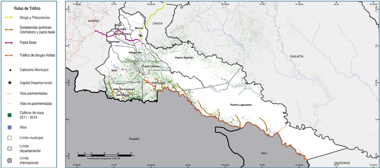 El departamento del Putumayo presenta condiciones geoestratégicas particulares que propician la presencia de conflictos territoriales, que devienen en violencia territorial; es un espacio fronterizo con Ecuador y Perú, con una rica y compleja geografía selvática; y también es una zona de transición también entre las realidades y posibilidades andinas, y los vacíos y carencias amazónicas. Posiblemente por estas condiciones geoestratégicas, el Putumayo ha sido: primero, zona de cultivos de coca y de laboratorios de procesamiento de esta; segundo, paso de contrabando de productos diversos, especialmente, de armas e insumos químicos; y tercero, lugar de disputa entre la lógica de acaparamiento de tierras (asociados a proyectos productivos o extractivos de gran escala o megaproyectos de infraestructura) y la de pequeños y medianos campesinos que luchan por posicionar sus productos tradicionales en mercado locales, como de los grupos indígenas que aún sobreviven en la zona3 y que pugnan por el acceso a la tierra como capital social, cultural, simbólico y ancestral.