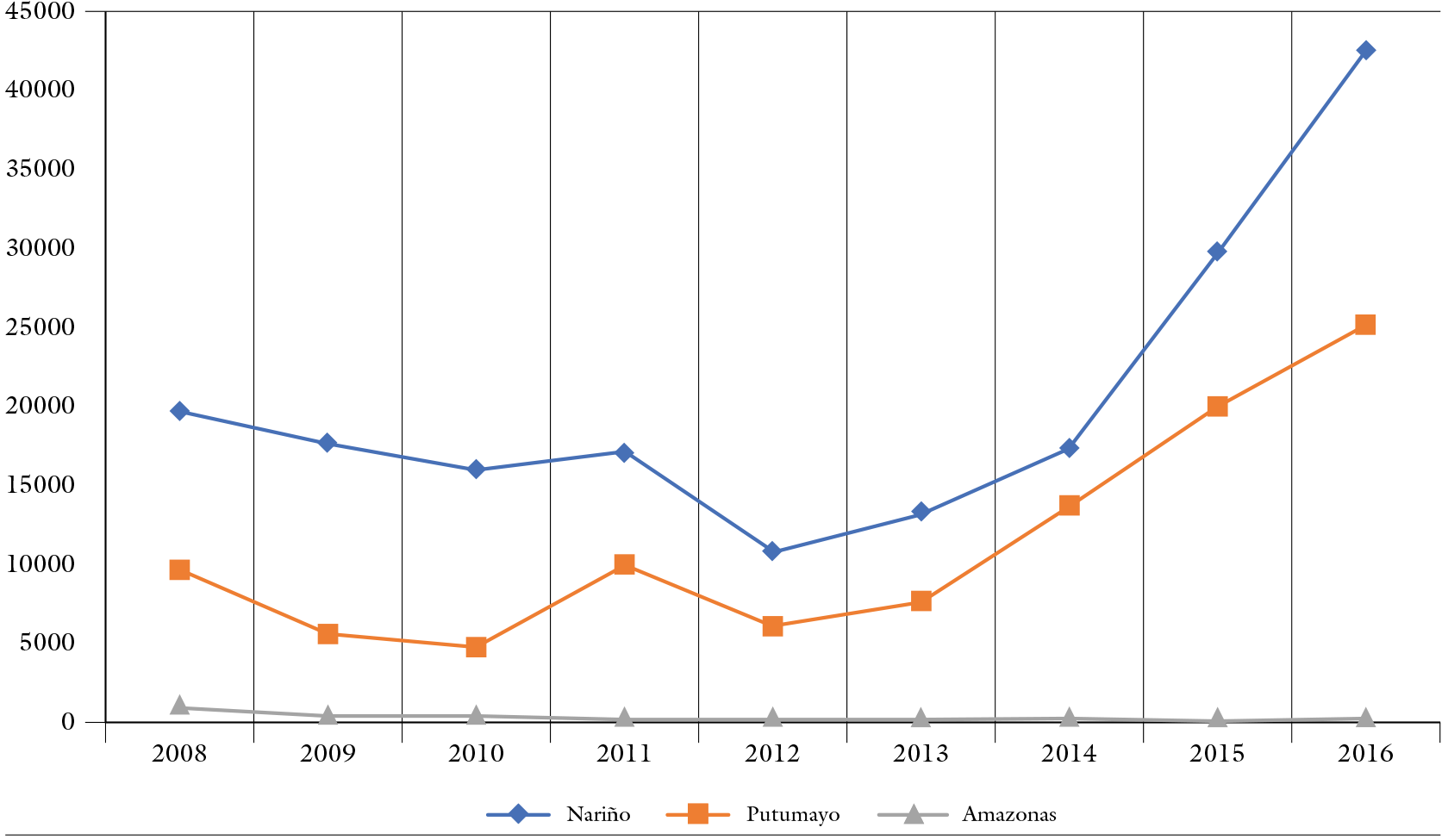 En este sentido, es claro que la circunstancia de la dinámica fronteriza de estos mercados ilegales no es exclusiva del departamento del Putumayo, sino que es un corredor estratégico a lo largo de todas las fronteras nacionales; de hecho, para el año 2016 el Informe oficial de la ONU (UNODC, 2017) establecía que los departamentos de Nariño, Putumayo y Norte de Santander eran los más afectados por el cultivo de la coca, concentrando el 63% de la producción nacional. Para el caso puntual de la frontera sur del país, la que nos interesa de forma preponderante, vemos que, entre el 2008 y el 2016 (figura 3), las hectáreas cultivadas pasaron de 30.106 a 67.956, con un importante incremento porcentual en el departamento del Putumayo.