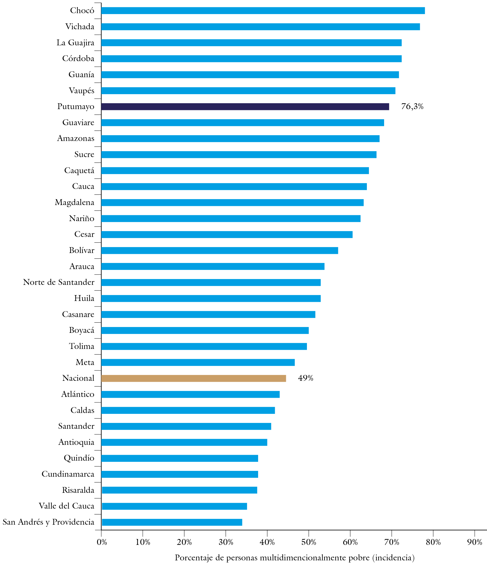 Frente a las cifras de pobreza multidimensional,7 se aprecia que el departamento tiene una incidencia de 76,3% de ella (figura 4), cifra muy superior a la observada a nivel nacional, del 49%; esto establece que aproximadamente el 80% de la población del Putumayo no tiene unas condiciones materiales, educativas, laborales, de salubridad y acceso a la salud y bienestar en general, que los favorezca, antes que perjudicarlos. Esta situación es propia tanto de las áreas urbanas como rurales, puesto que las estadísticas muestran que ambas son superiores al promedio nacional; 65% versus 39% y 88% versus 80 %, respectivamente. Contrasta la gran distancia relativa existente en las áreas urbanas, con la cercanía para las rurales, que muestra, en general para el país, la concentración de oportunidades en las primeras en desmedro de las segundas y, por ende, el significativo retraso de las condiciones urbanas en el departamento.