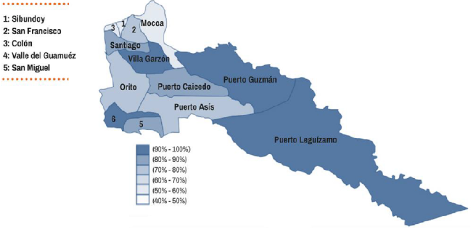 En relación con el comportamiento espacial del IPM al interior del departamento (figura 5), se tiene que, los mayores índices de pobreza se encuentran en los municipios de Puerto Leguízamo, Puerto Guzmán y Villa Garzón, casi alineados los tres a lo largo del río Caquetá y en el de Valle del Gauméz, limítrofe con el Ecuador.