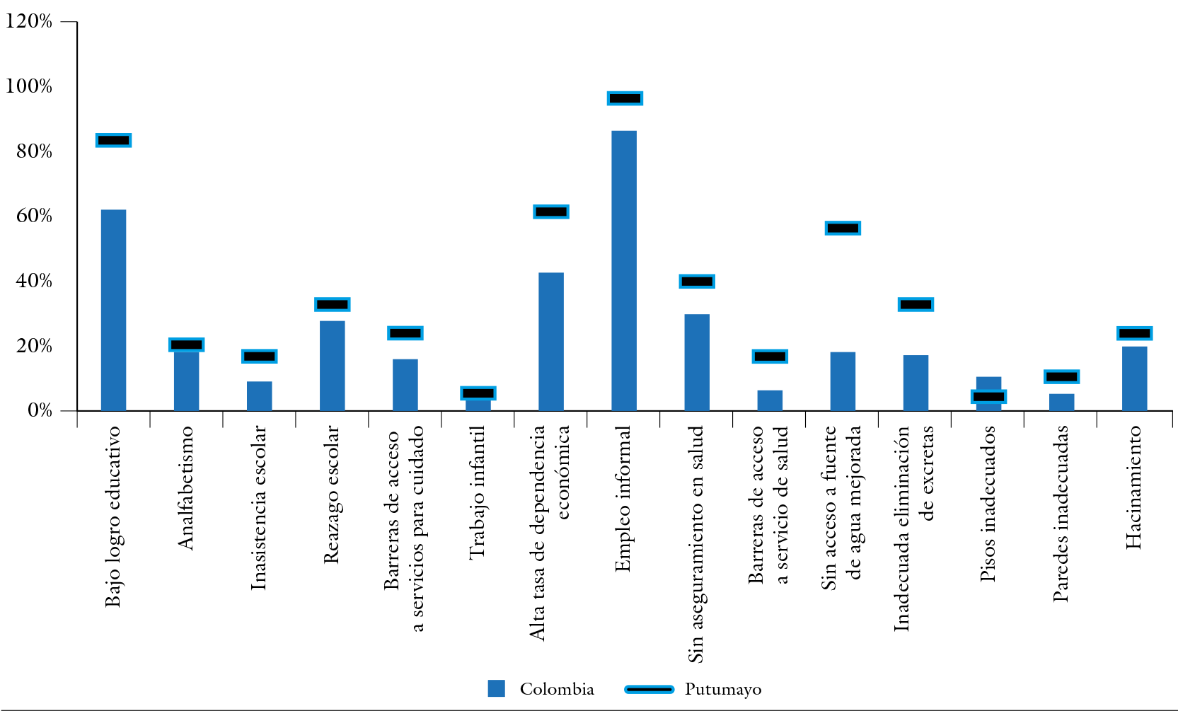 En cuanto a las variables que componen el índice, el departamento, en comparación con el país, presenta rezago en todas ellas (figura 6), a excepción de la de pisos inadecuados, validando esto el significativo retraso que sufre la población, expresado líneas atrás, y la dimensión y complejidad de la intervención a realizar para modificar esta situación.