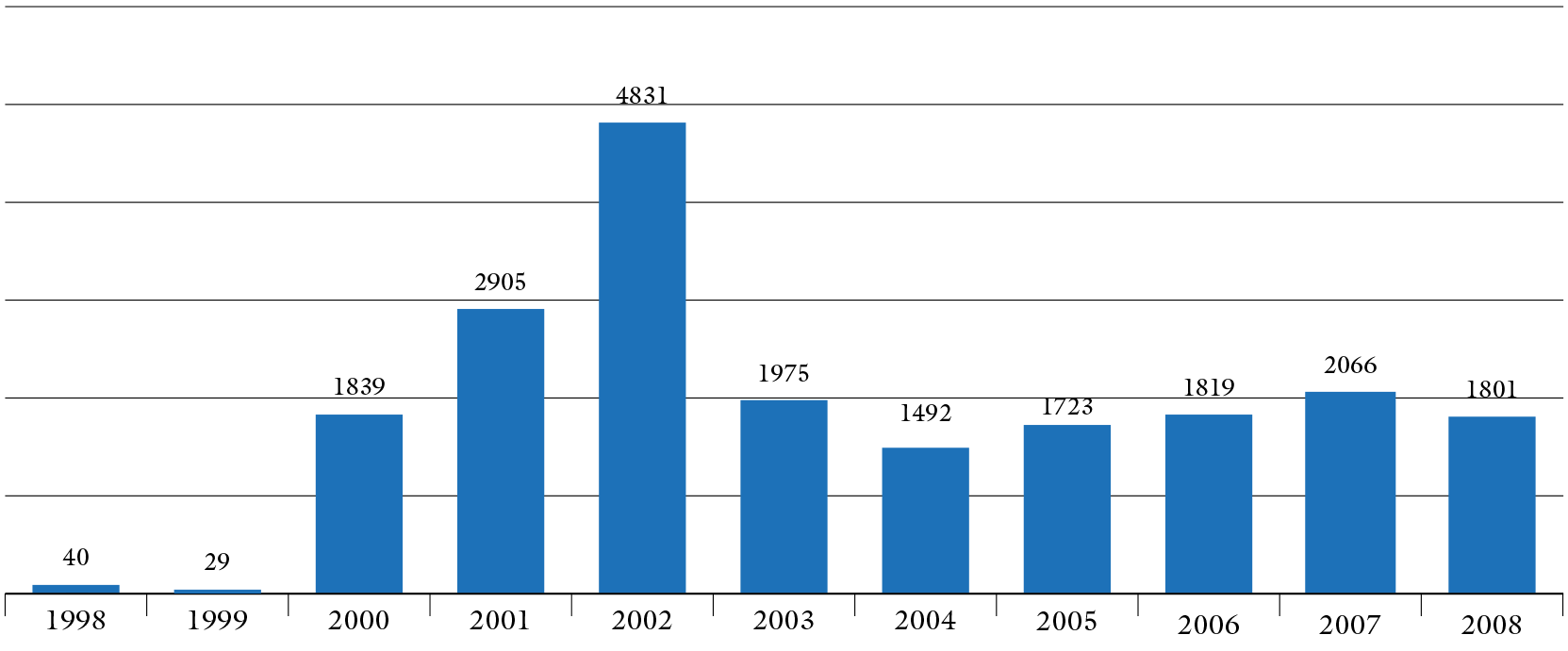Y es que el arribo de población desplazada tiene ya un comportamiento histórico en la ciudad; el SIPOD tiene un registro, entre 1998 y 2008, para Mocoa, de 20.520 personas9 (figura 7); el bajísimo número de registros en los dos primeros años se debe al inició de la implementación del sistema de registro SUR (antecesor del SIPOD). Ya, en el 2000, el sistema entró en pleno funcionamiento y las cifras muestran la dramática situación; ese año fueron registradas más de 1.800 personas, manteniéndose la cifra en ascenso, hasta el pico más alto registrado en 2002, con 4.831 personas/año. Luego hubo un descenso hasta el valor más bajo, pero nada despreciable de 1.492 personas en el 2004. Nuevamente de forma lenta fue subiendo hasta presentar una línea relativamente estable en 2008, con una cifra de 1.801 personas ese año (Sánchez, 2012).